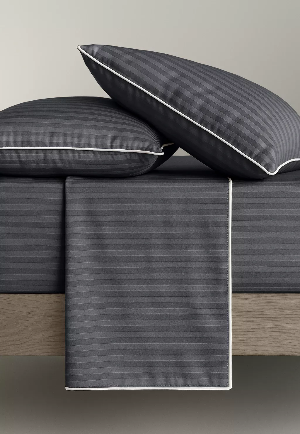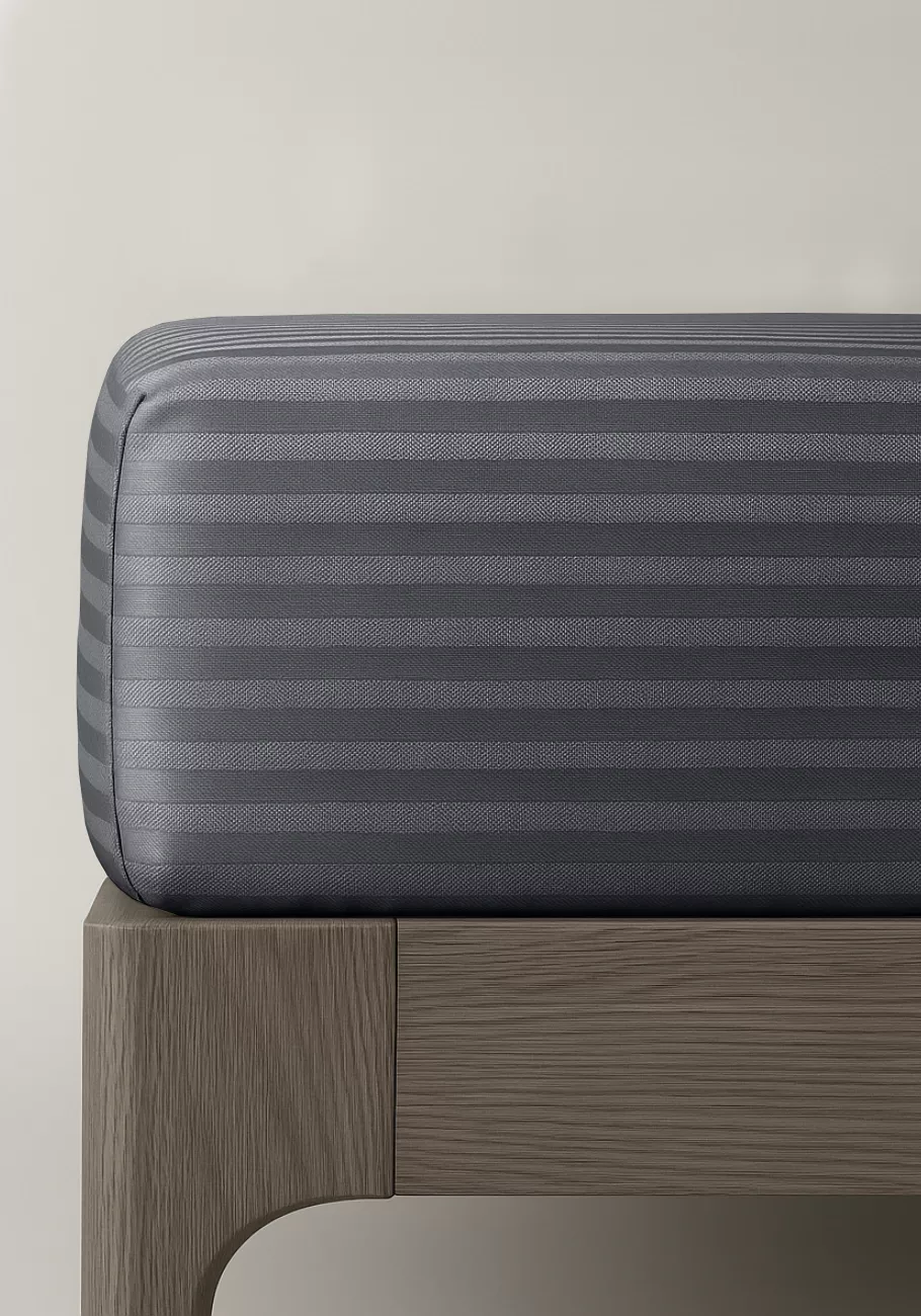 Luksusowe prześcieradło adamaszkowe 140×200 grafit z gumką marki Maro Home. Wykonane zostało z najwyższej jakości bawełny satynowej o mocnym i grubym splocie. Tkanina jest miękka, delikatna, jedwabista w dotyku, posiada idealnie jednorodną powierzchnię. Odpowiedni splot tkaniny nadaje jej połysk, a delikatne paski dodają elegancji i szyku w każdej sypialni. Prześcieradło nie jest śliskie, natomiast bardzo trwałe, starannie uszyte, co zapewnia długi okres użytkowania.