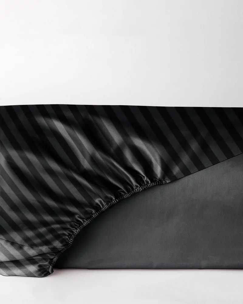 Luksusowe prześcieradło adamaszkowe 180×200 czarne z gumką marki Maro Home. Wykonane zostało z najwyższej jakości bawełny satynowej o mocnym i grubym splocie. Tkanina jest miękka, delikatna, jedwabista w dotyku, posiada idealnie jednorodną powierzchnię. Odpowiedni splot tkaniny nadaje jej połysk, a delikatne paski dodają elegancji i szyku w każdej sypialni. Prześcieradło nie jest śliskie, natomiast bardzo trwałe, starannie uszyte, co zapewnia długi okres użytkowania.