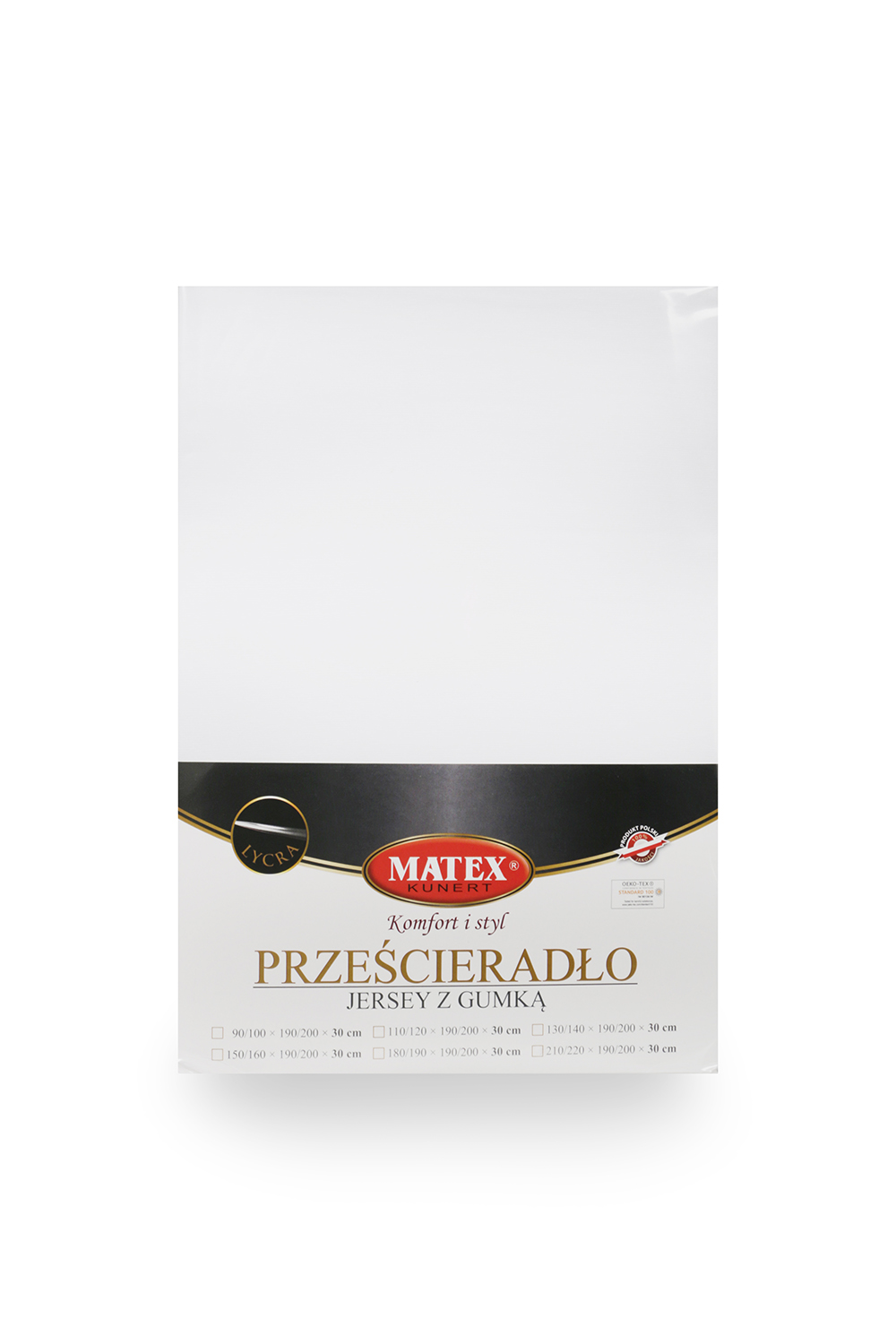 Prześcieradło jersey z lycrą z gumą na materac roz. 210/220×190/200 cm Rozmiar (cm) – 210/220×190/200×30 Kolor / wzór – biały 01 Gramatura g/m2 – 190 Skład materiału – 0,965 bawełna, 3,5% lycra Certyfikat OEKO-TEX – Tak