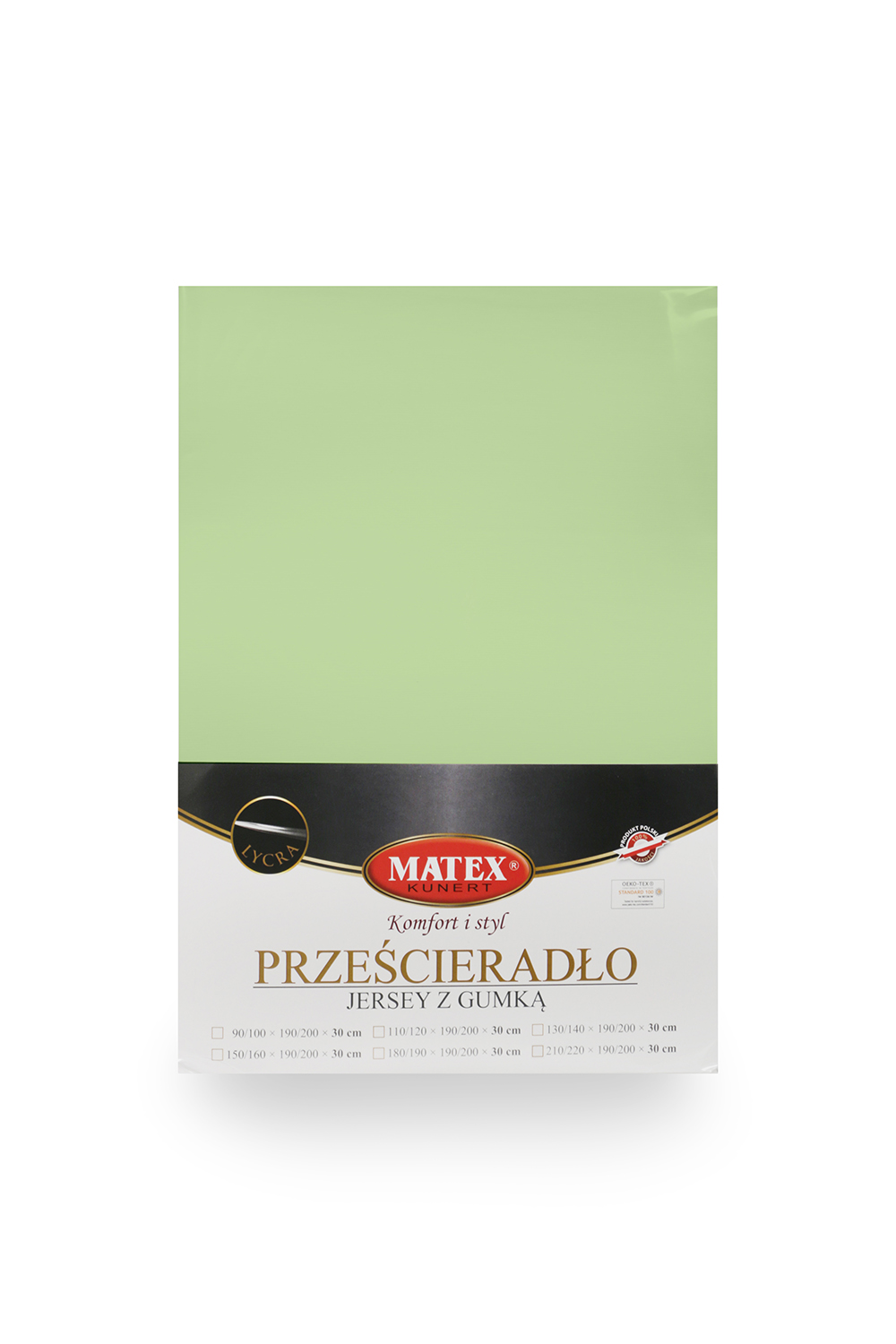 Prześcieradło jersey z lycrą z gumą na materac roz. 210/220×190/200 cm Rozmiar (cm) – 210/220×190/200×30 Kolor / wzór – seledynowy 52 Gramatura g/m2 – 190 Skład materiału – 0,965 bawełna, 3,5% lycra Certyfikat OEKO-TEX – Tak