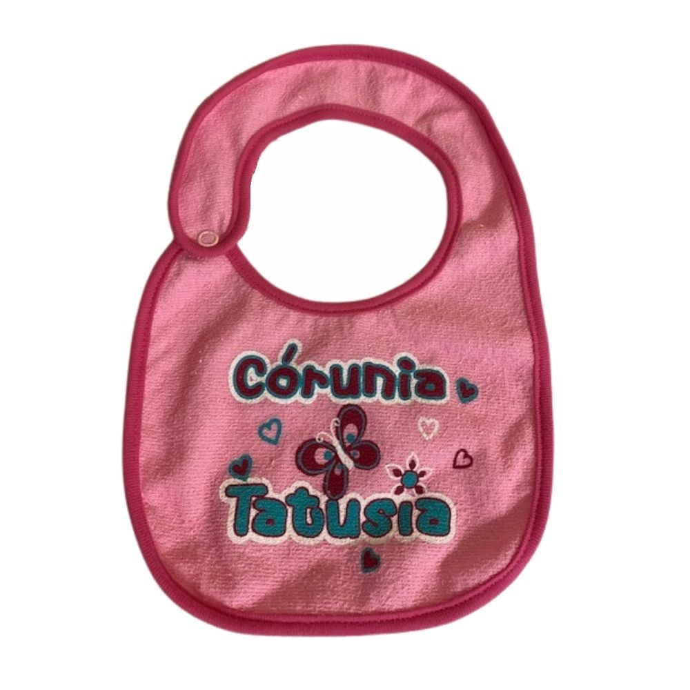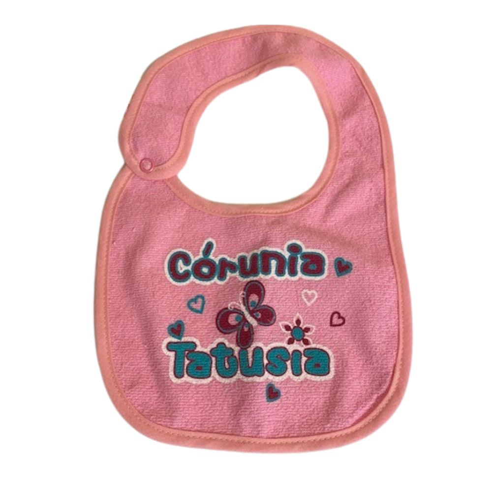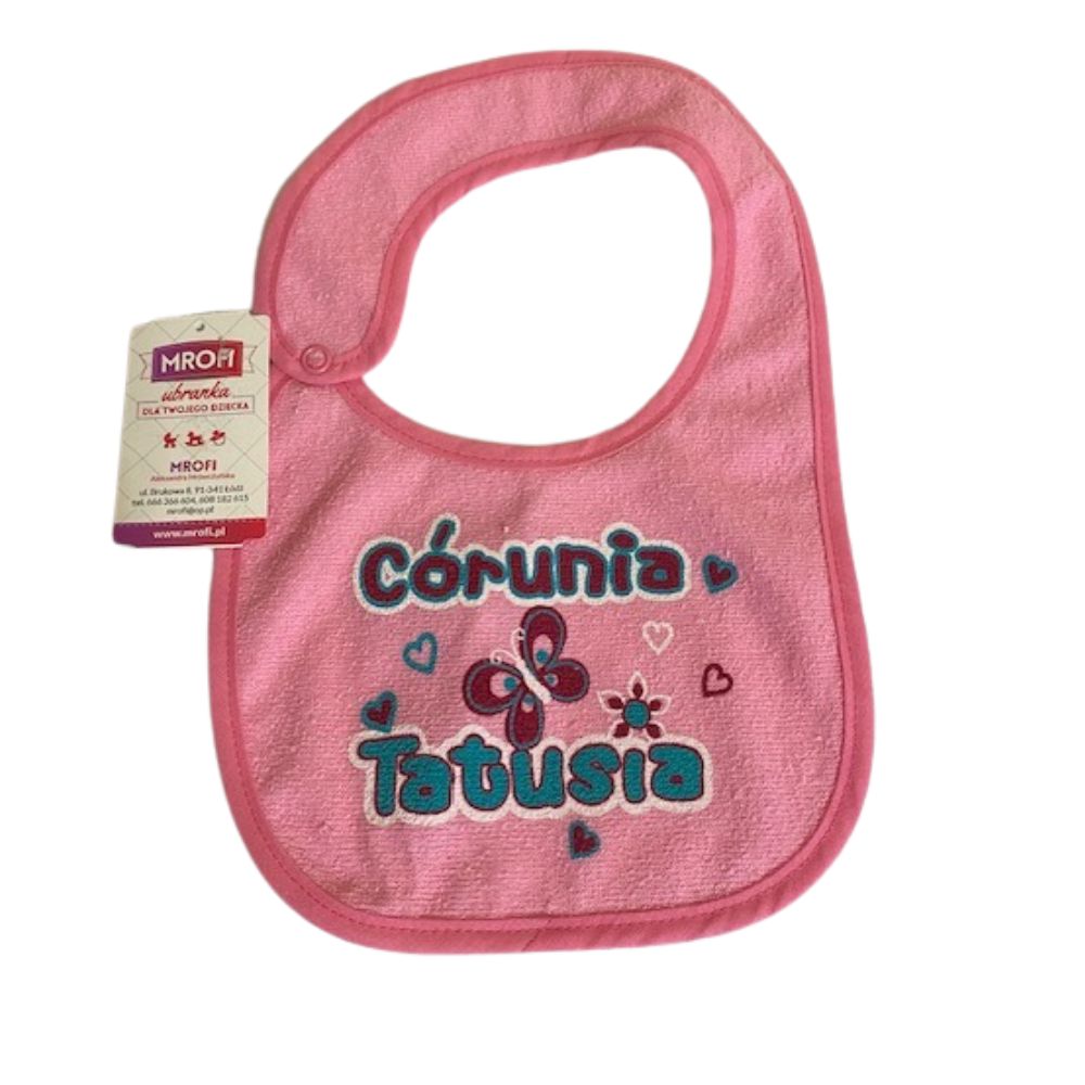 Profesjonalnie wykonany, nieprzemakalny śliniaczek dla niemowląt, ozdobiony napisem.