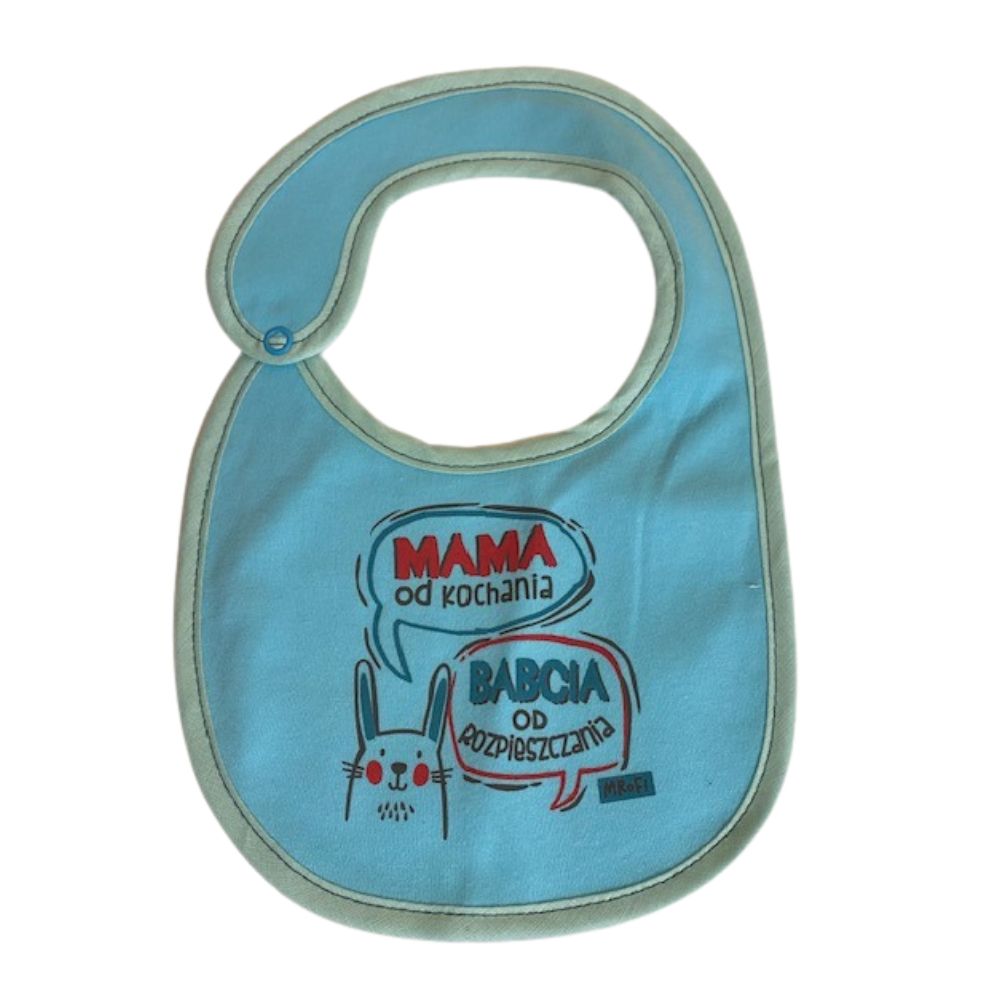 Profesjonalnie wykonany, nieprzemakalny śliniaczek dla niemowląt, ozdobiony napisem.